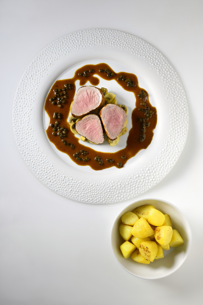 Varkensmedaillon met champignons, peperroomsaus en aardappeltjes