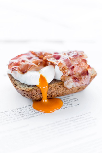 De foto van Hanne dateert uit haar schoolperiode: niet alleen het gepocheerde ei is perfect gelukt, ook de foto zelf is om in te bijten. Let op de ondergrond: geen krantenpapier, maar een van haar cursussen.