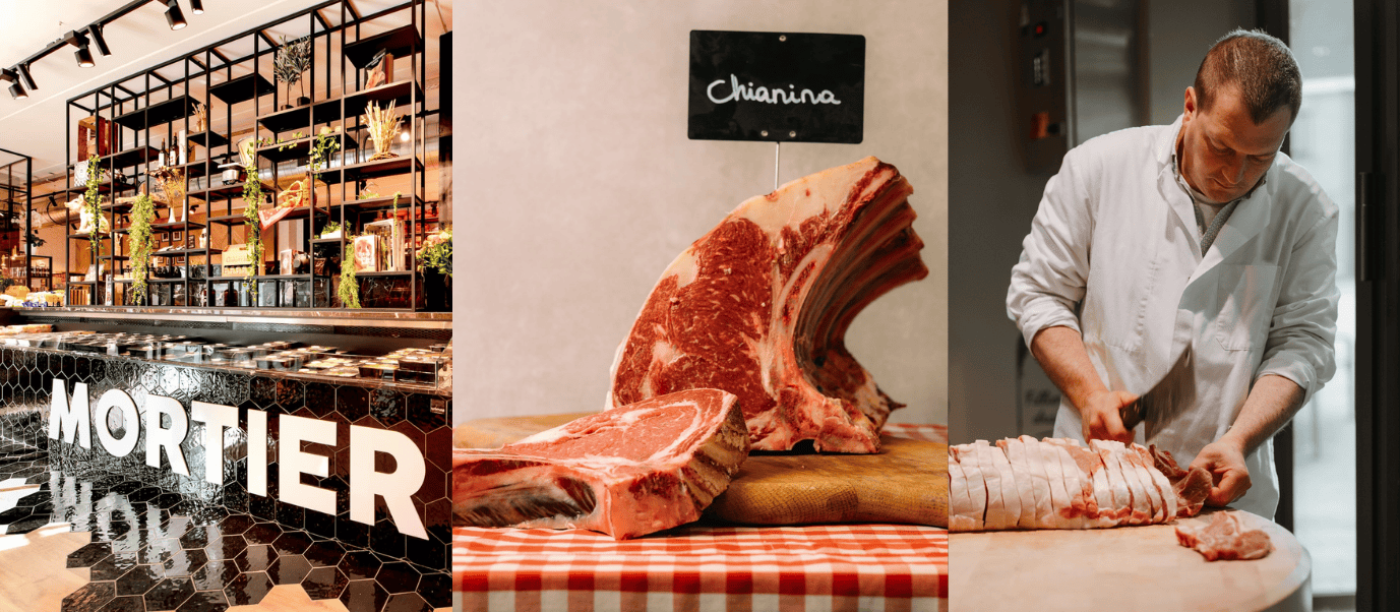 In Deinze staat Slagerij Mortier al sinds 1882 synoniem voor ambacht en kwaliteit. Wat begon als een klassieke slagerij groeide doorheen de jaren uit tot een echte belevingswinkel waar traditie en vernieuwing hand in hand gaan. Vandaag staat de vijfde generatie aan het roer, met dezelfde passie en toewijding als hun voorgangers.
