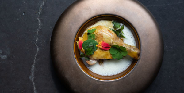 Leg de jonge kip even terug op de grill aan beide kanten. Neem een bord en dresseer de asperges in het midden. Leg daar een halve coquelet op en werk af met de kippenjus.