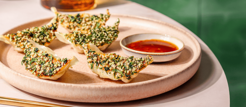 Strooi de furikake of het sesamzaad op een schoteltje. Dip de gyoza's in de saus en daarna in de furikake of het sesamzaad. Presenteer ze op een mooie schaal.
