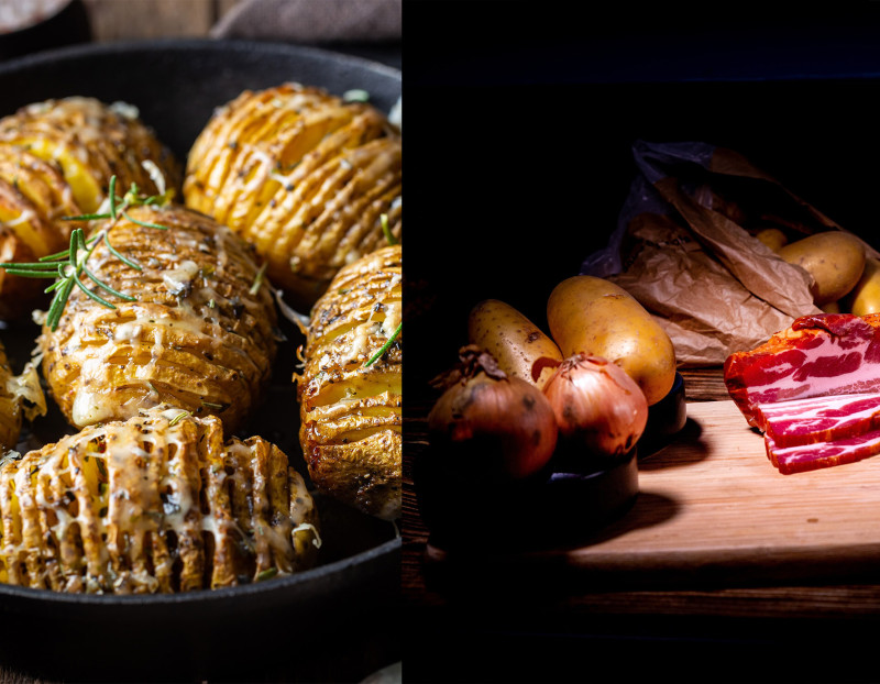 Snijd de aardappels hasselback-stijl. Leg elke aardappel tussen de stelen van twee houten lepels en snijd om de paar millimeter inkepingen tot net niet door. Zo ontstaan fijne waaiervormige plakjes die aan de onderkant verbonden blijven.