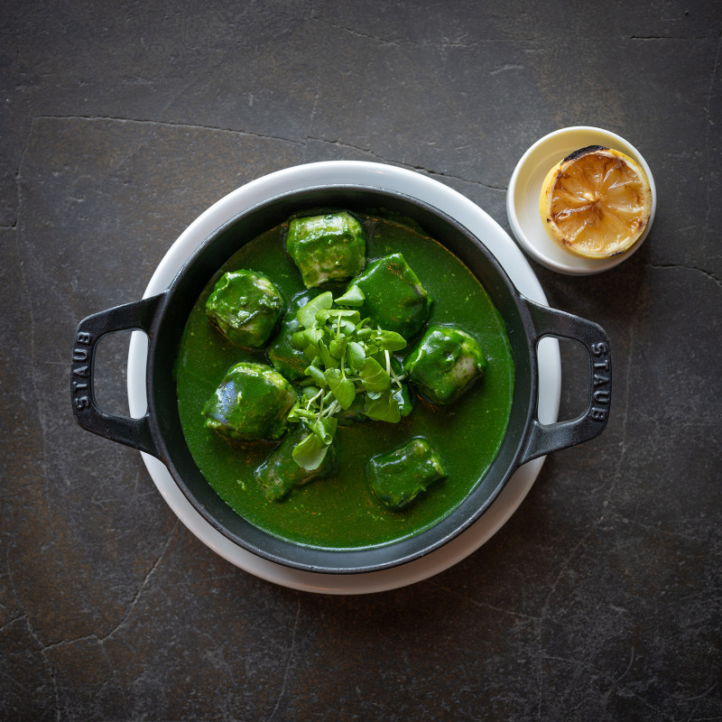 Pluk de blaadjes van de groene kruiden. Blancheer de peterselie, de kervel, de waterkers, de spinazie, de munt en de dragon enkele seconden in kokend water. Laat vervolgens afkoelen in een kom met ijswater. Pers het vocht met je handen uit de geblancheerde kruiden. Doe de uitgelekte kruiden samen met de zurkel, een scheut olijfolie en de visfumet in de blender. Mix tot een gladde, felgroene saus.