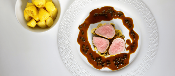 Dresseer de champignons in het midden van de borden. Snijd het varkenshaasje in plakjes en schik die boven op de champignons. Serveer met de peperroomsaus en de gebakken aardappelen.